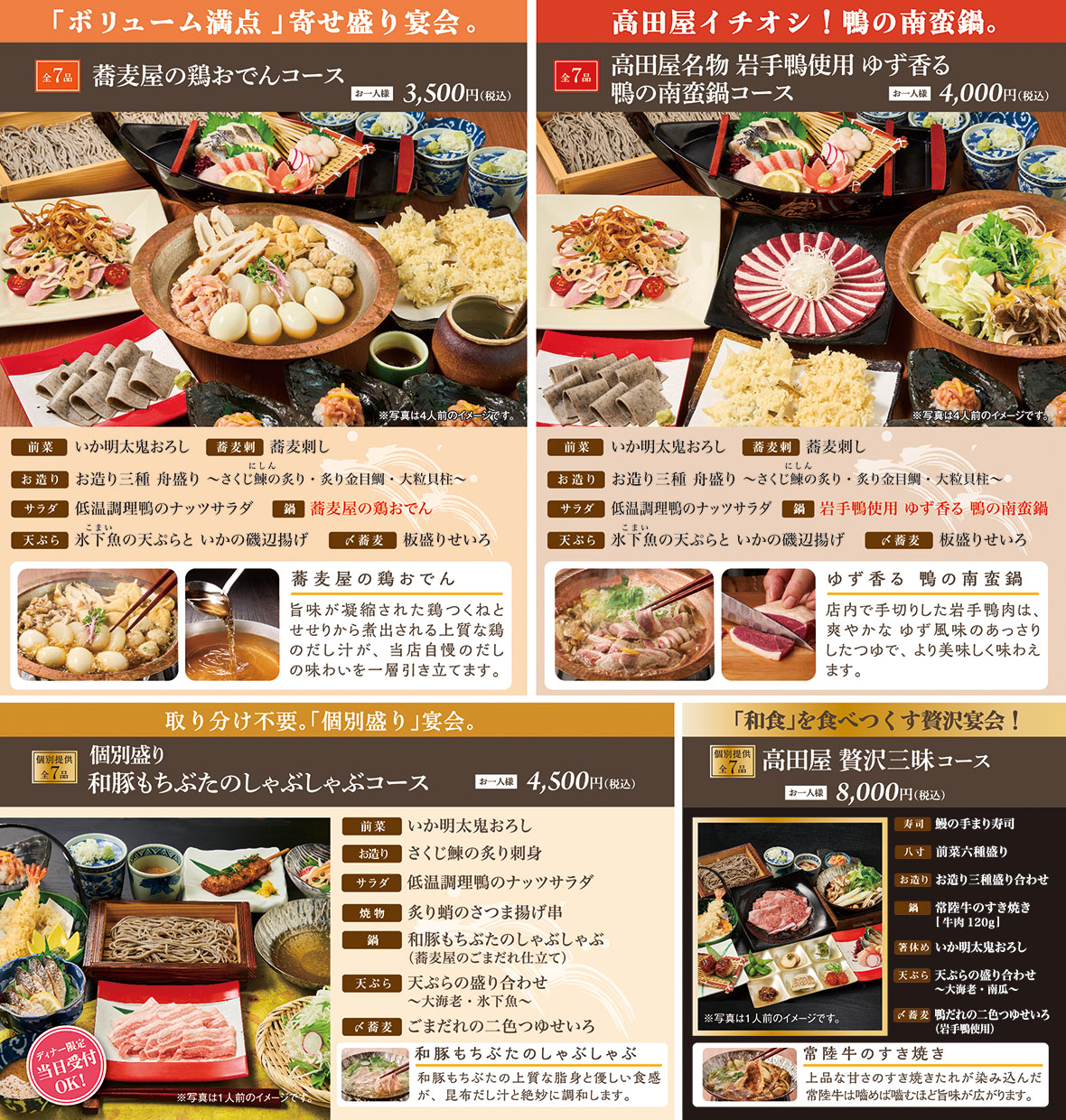 ごまそば高田屋では、365日24時間対応のオンライン予約。或いは、お電話による直接ご予約。