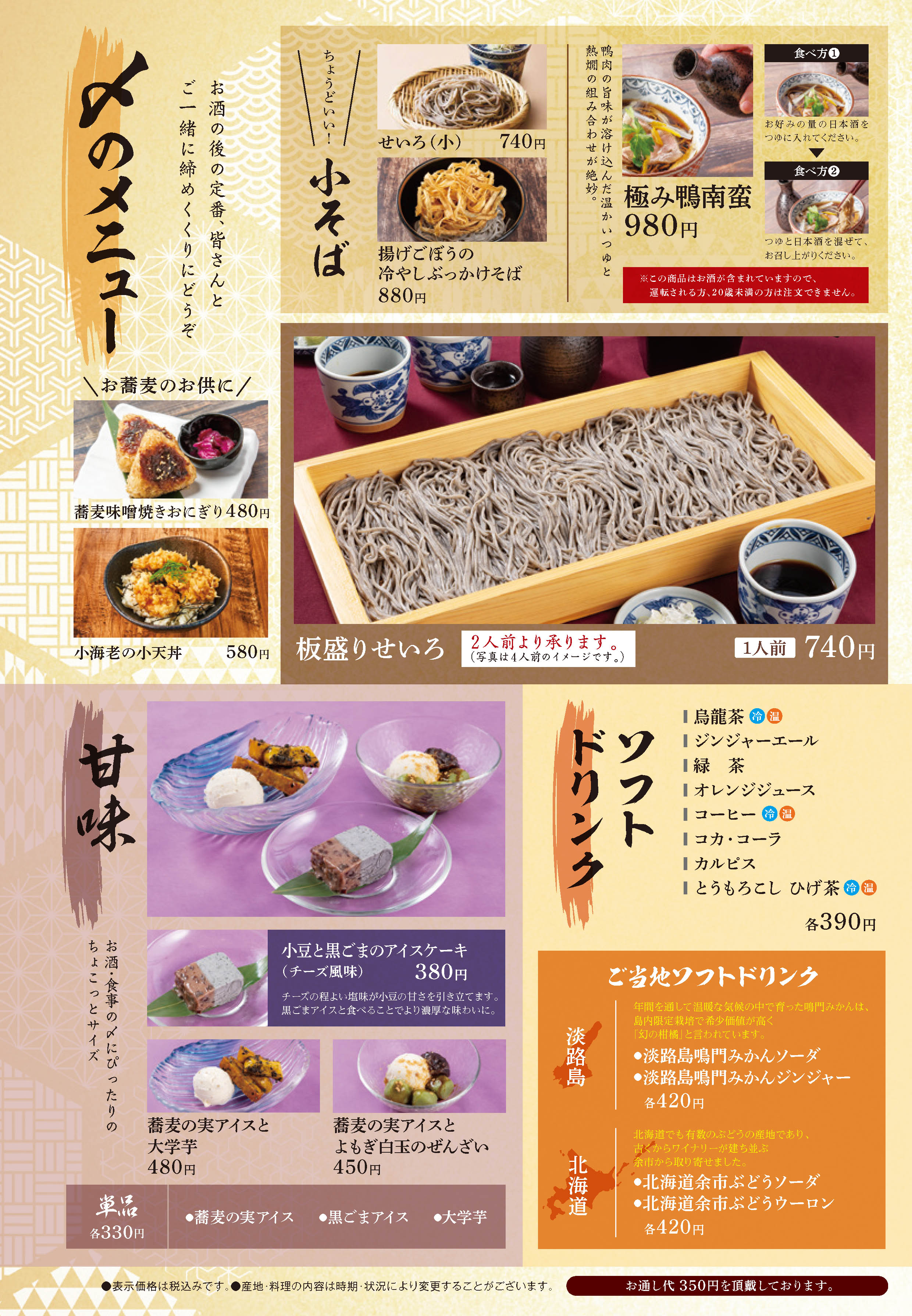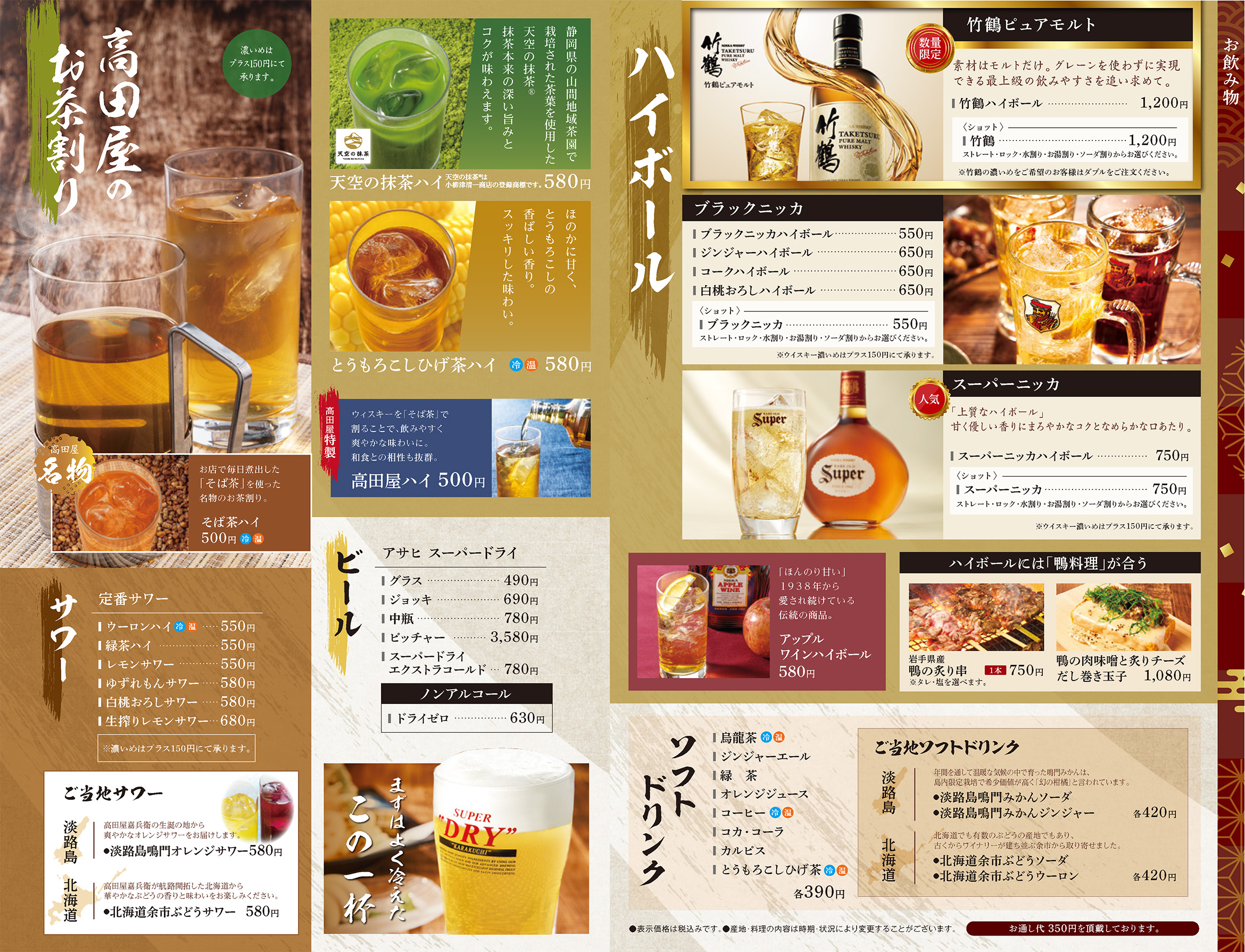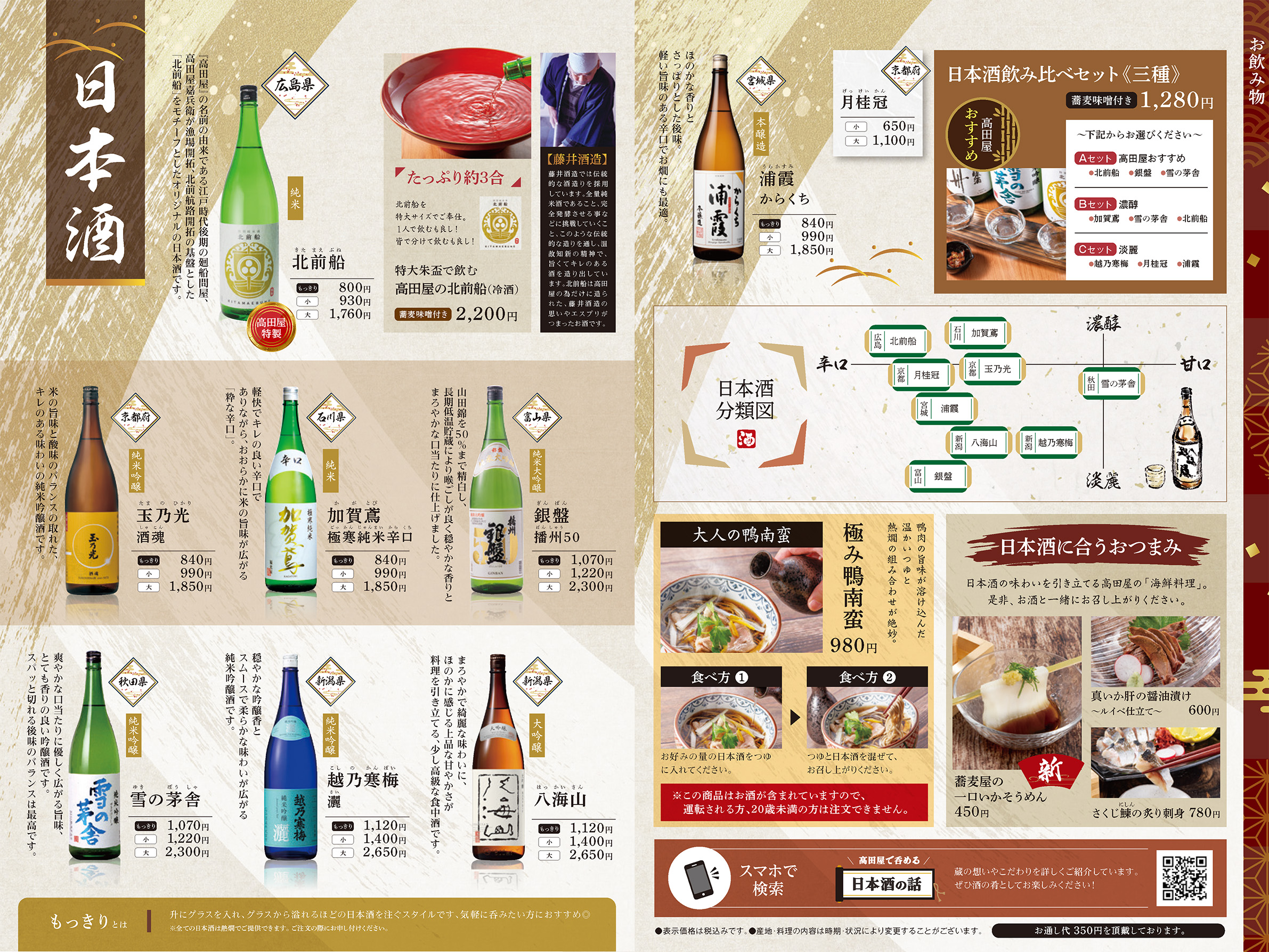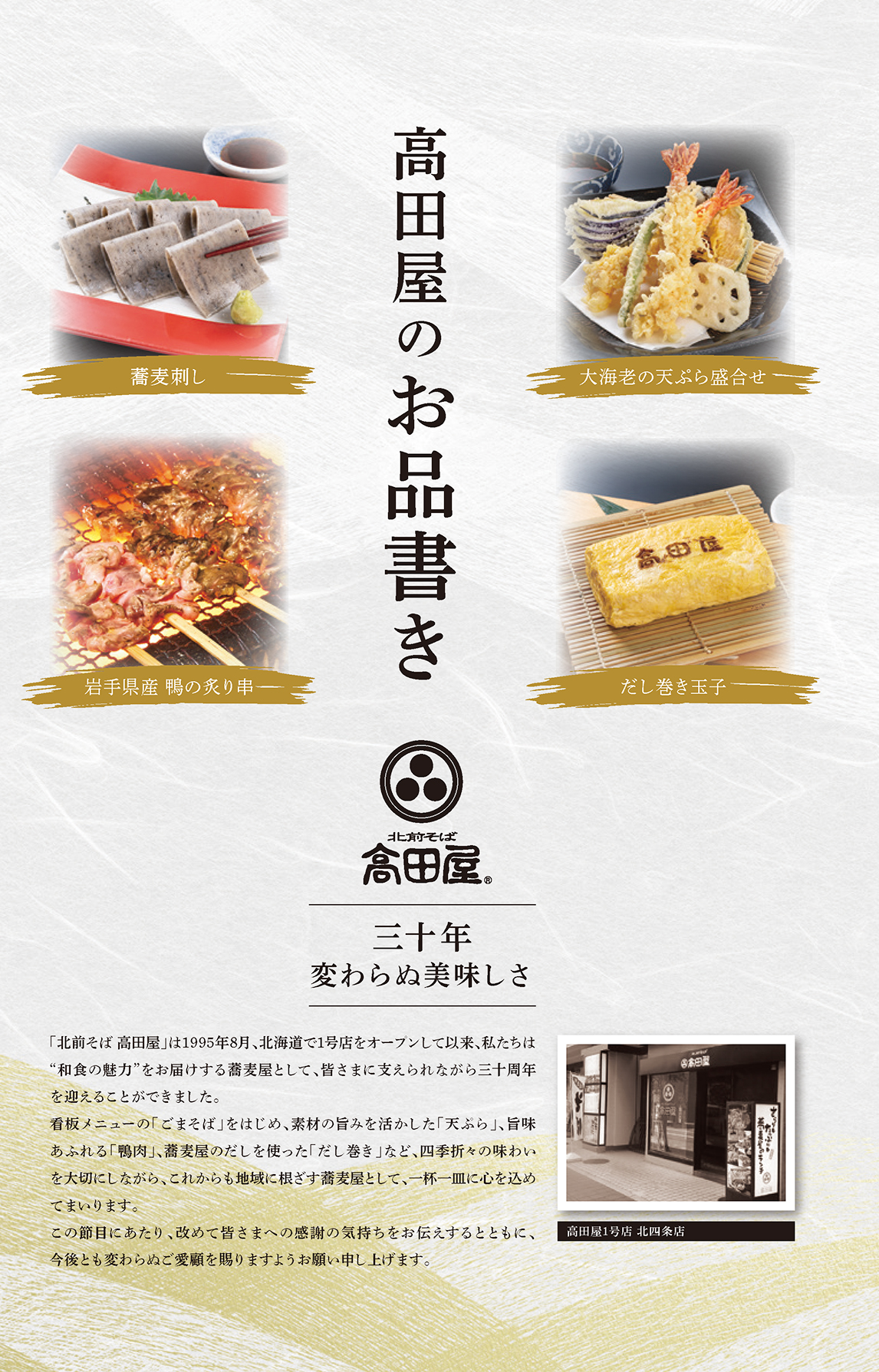 北前船を操り、蝦夷地と全国各地の交易築いた江戸時代の廻船問屋・高田屋嘉兵衛をモチーフに、各寄港より吟味した食材を取り寄せ、美味しい料理をご提供しています。また蕎麦屋ならではのメニュー、名物ごまそばも特長。